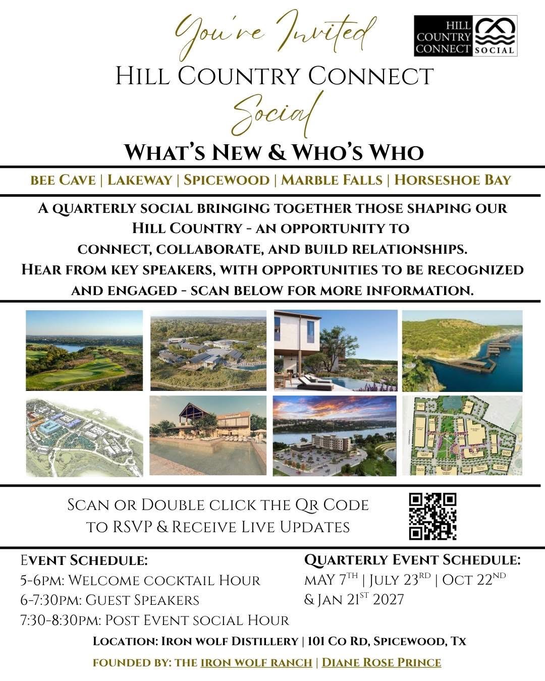 Iron Wolf Ranch 101 Co Rd 409, Spicewood, TX, United StatesIron Wolf Ranch & Distillery is proud to host the Hill Country Connect Social, a quarterly gathering designed to bring together the individuals shaping the future of the Hill Country.…